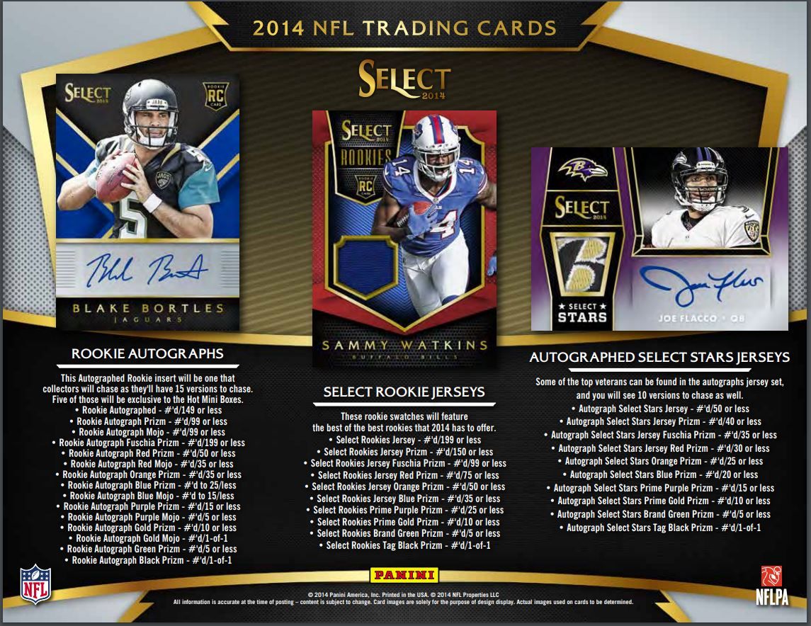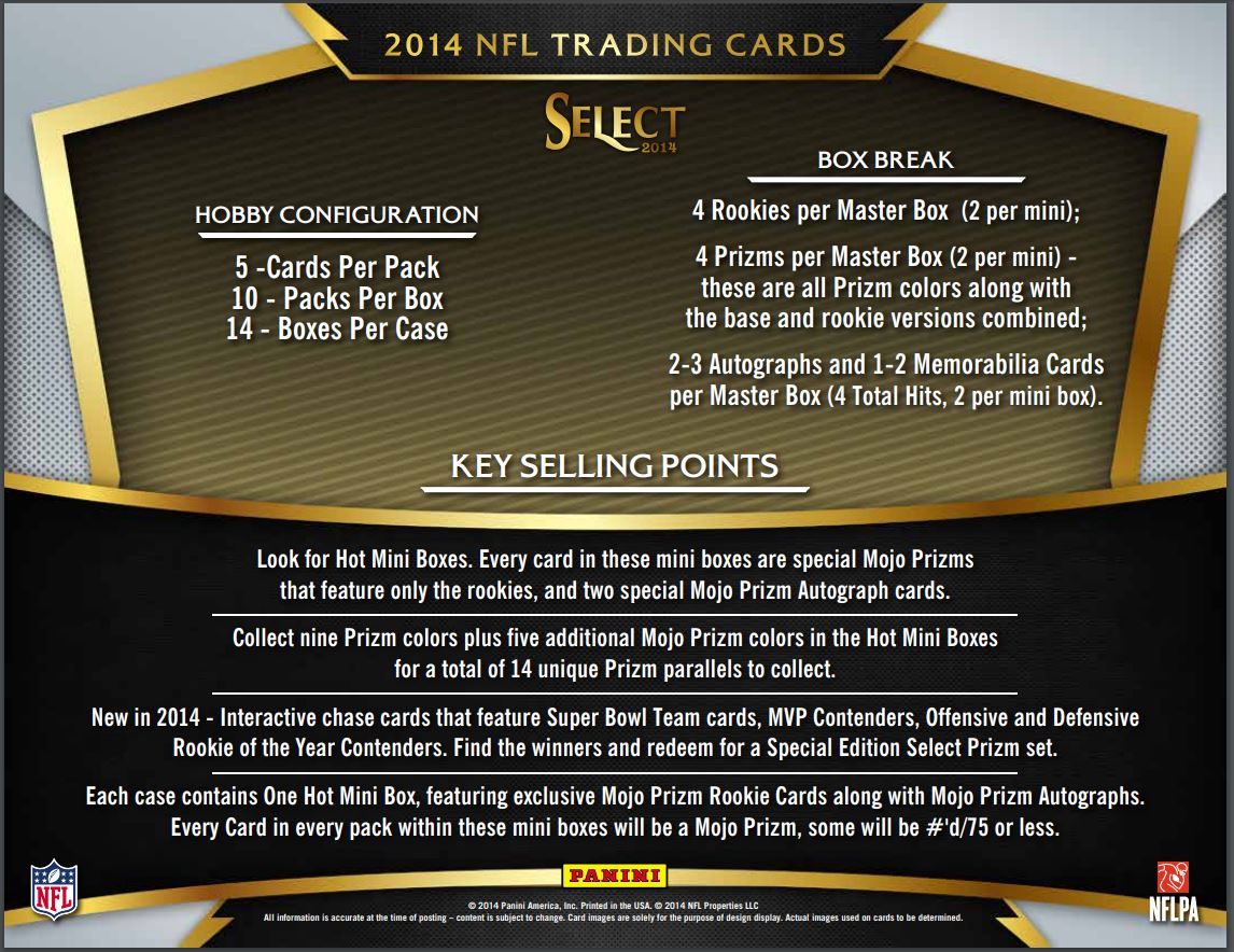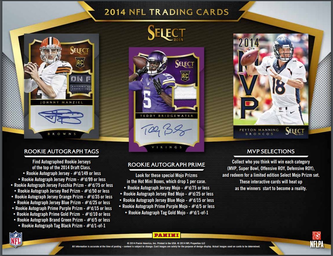 - New in 2014 – Interactive chase cards that feature Super Bowl Team cards, MVP Contenders, Offensive and Defensive Rookie of the Year Contenders. Find the winners and redeem for a Special Edition Select Prizm set.