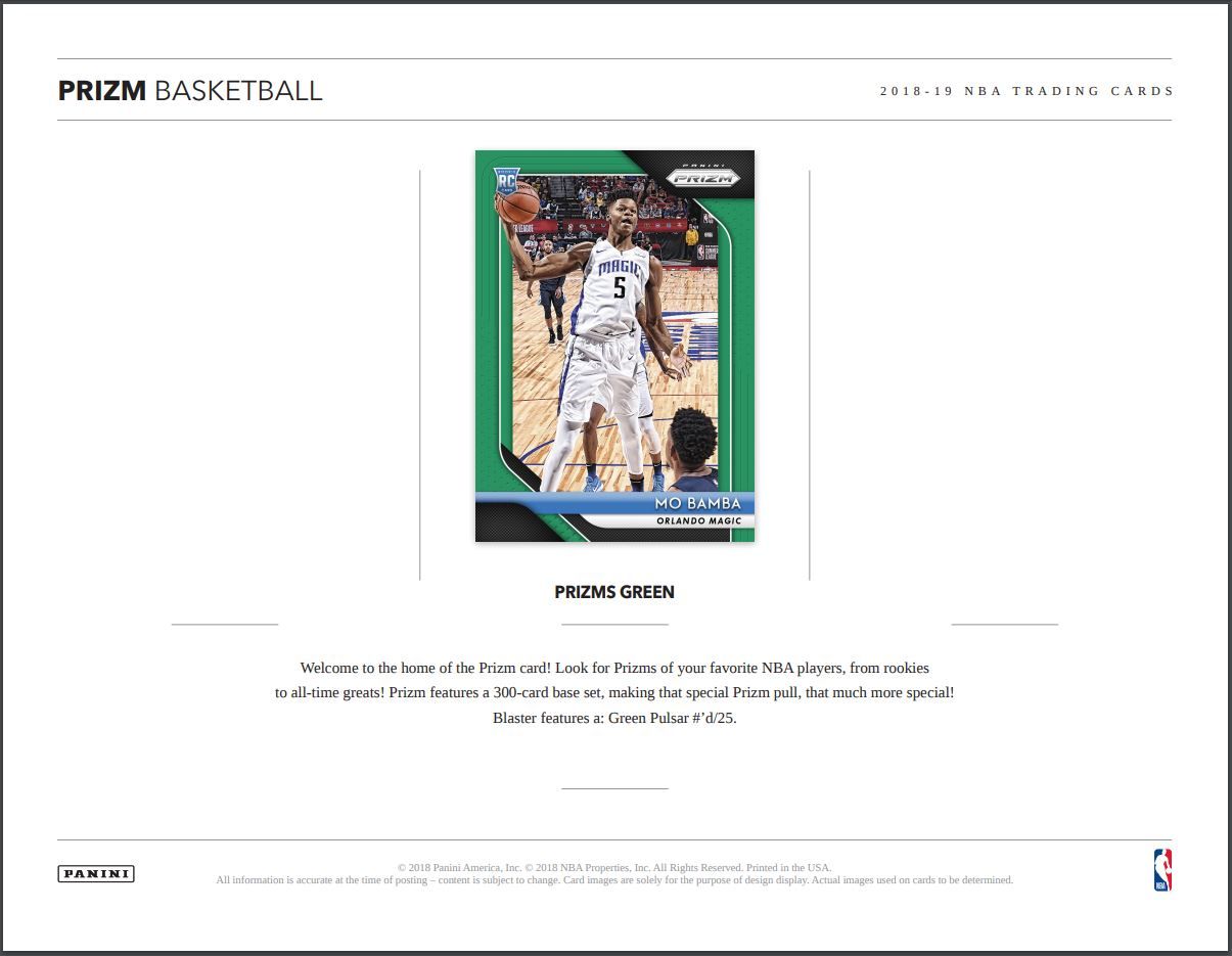 PRIZMS GREEN:Â Welcome to the home of the Prizm card! Look for Prizms of your favorite NBA players, from rookies to all-time greats! Prizm features a 300-card base set, making that special Prizm pull, that much more special! Blaster features a: Green Pulsar #’d/25.