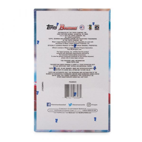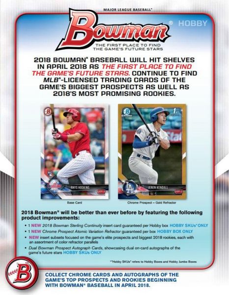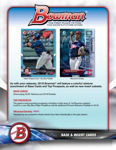 Top Prospects:Â The game’s most promising prospects, including a fresh array of 1st Bowman subjects. Look for a new Sky Blue Paper Parallel as well as additional Chrome Refractor Parallels in 2018.