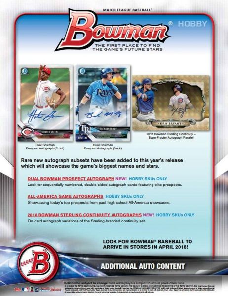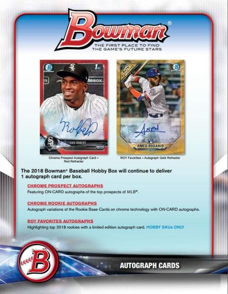 The 2018 Bowman Baseball Hobby Box will continue to deliver 1 autograph card per box.
