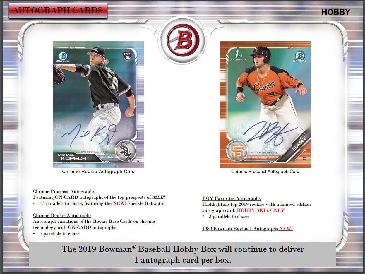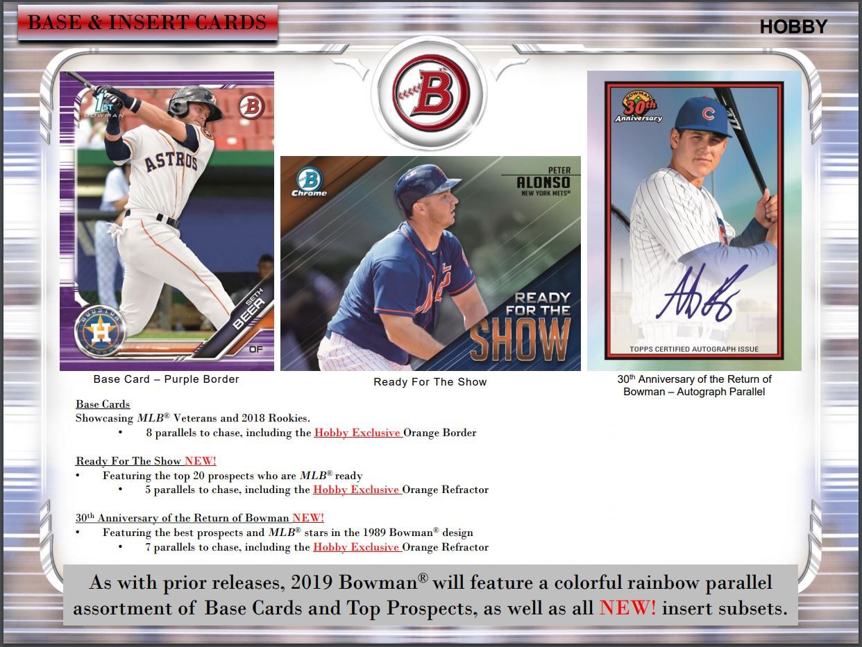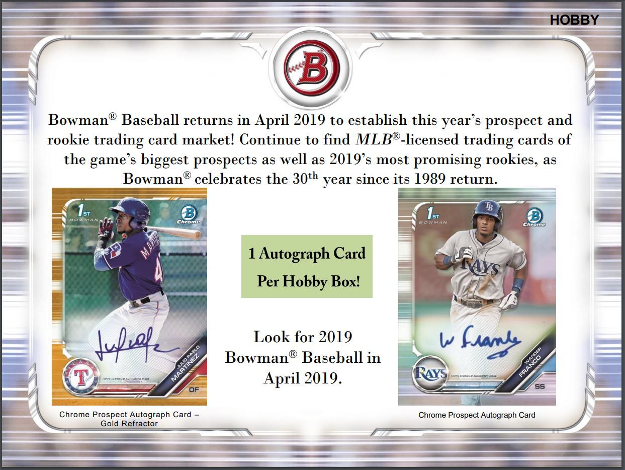 - Bowman Baseball returns in April 2019 to establish this year’s prospect and rookie trading card market! Continue to find MLB-licensed trading cards of the game’s biggest prospects as well as 2019’s most promising rookies, as Bowman celebrates the 30th year since its 1989 return.
