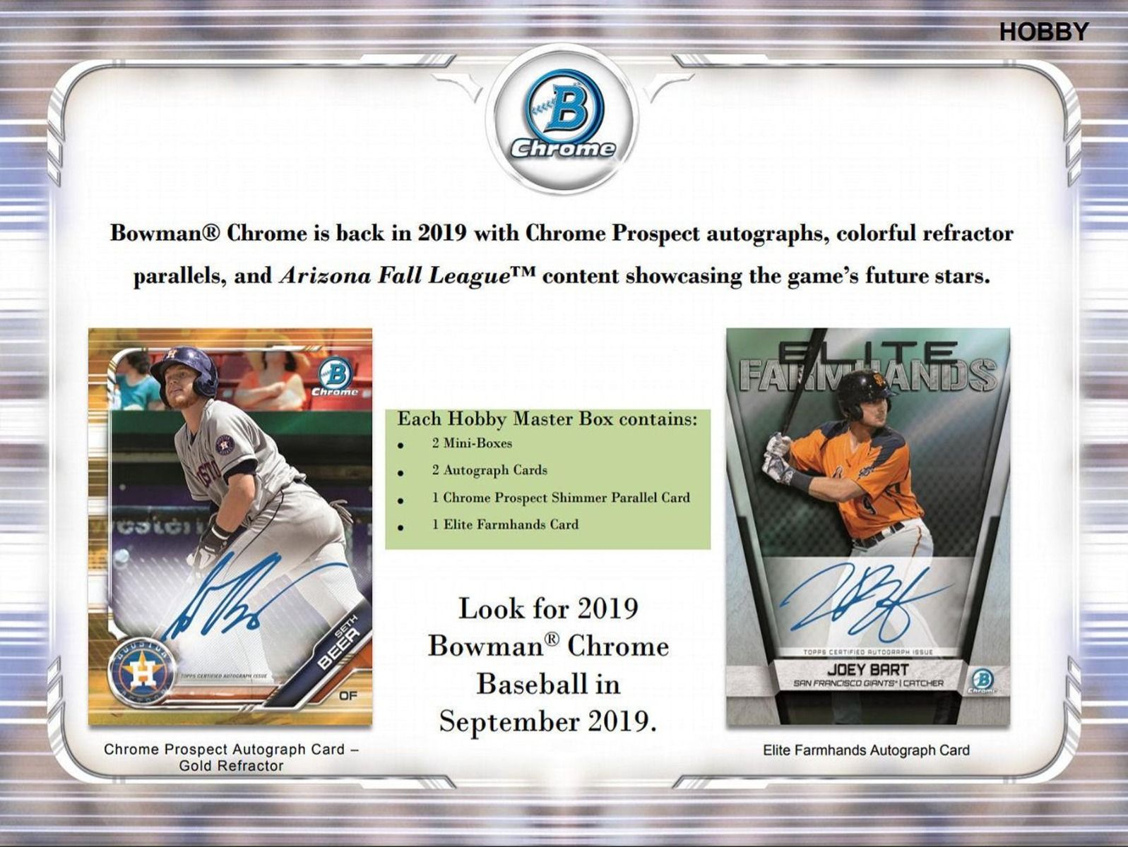 - Bowman Chrome is back in 2019 with Chrome Prospect autographs, colorful refractor parallels, and Arizona Fall League content showcasing the game’s future stars.