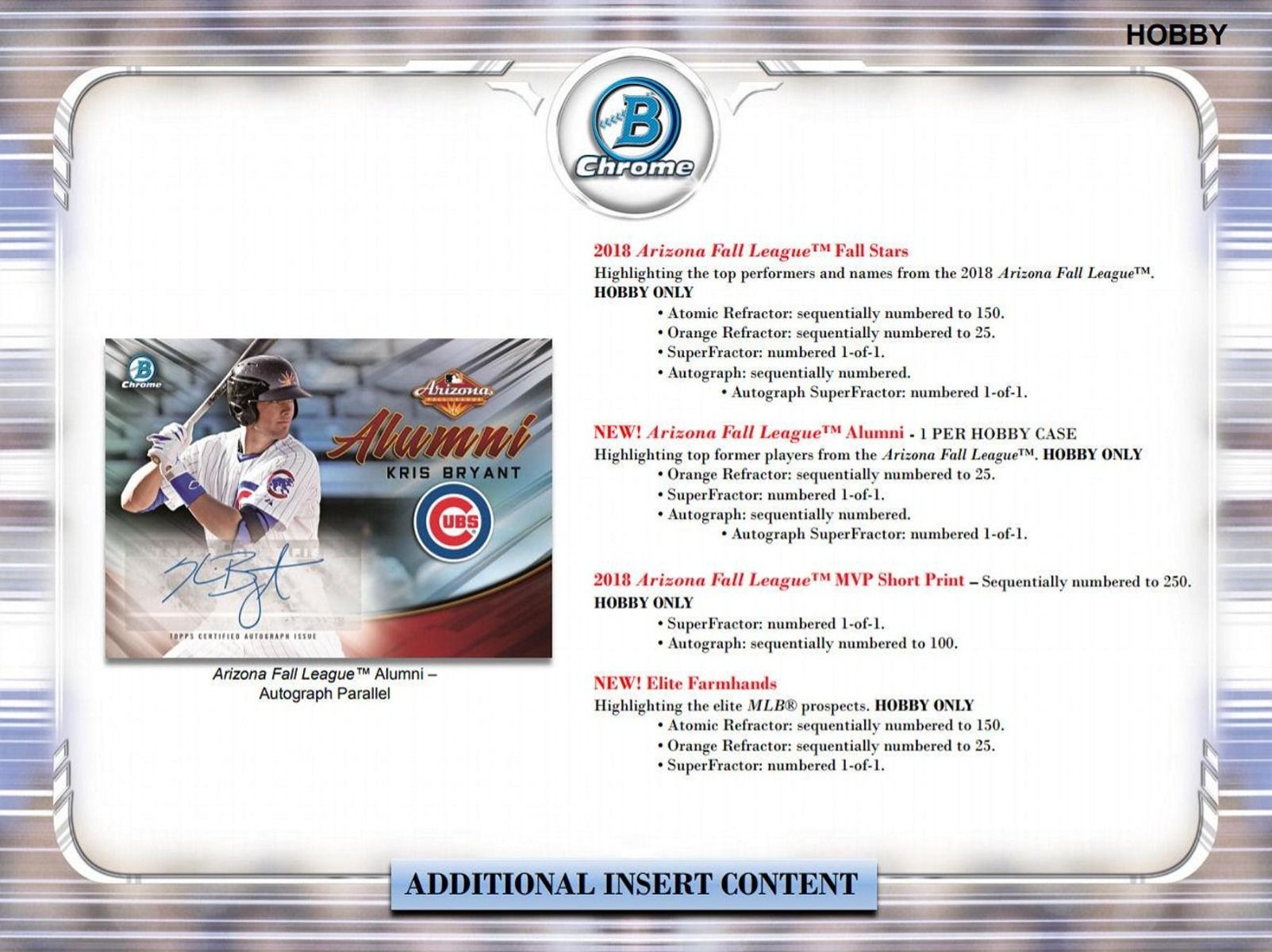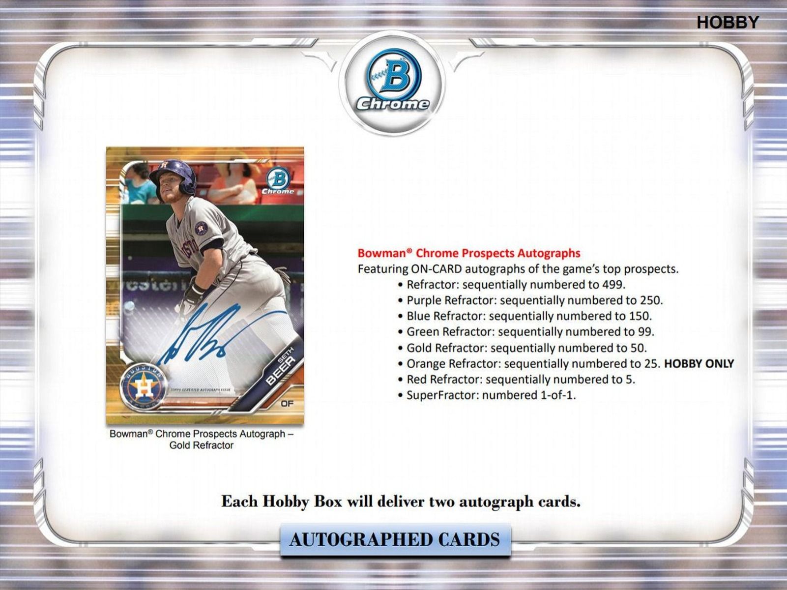 Bowman Chrome Prospects:Â Each pack of Bowman Chrome Baseball will feature 2 Chrome Prospect cards. HOBBY ONLY