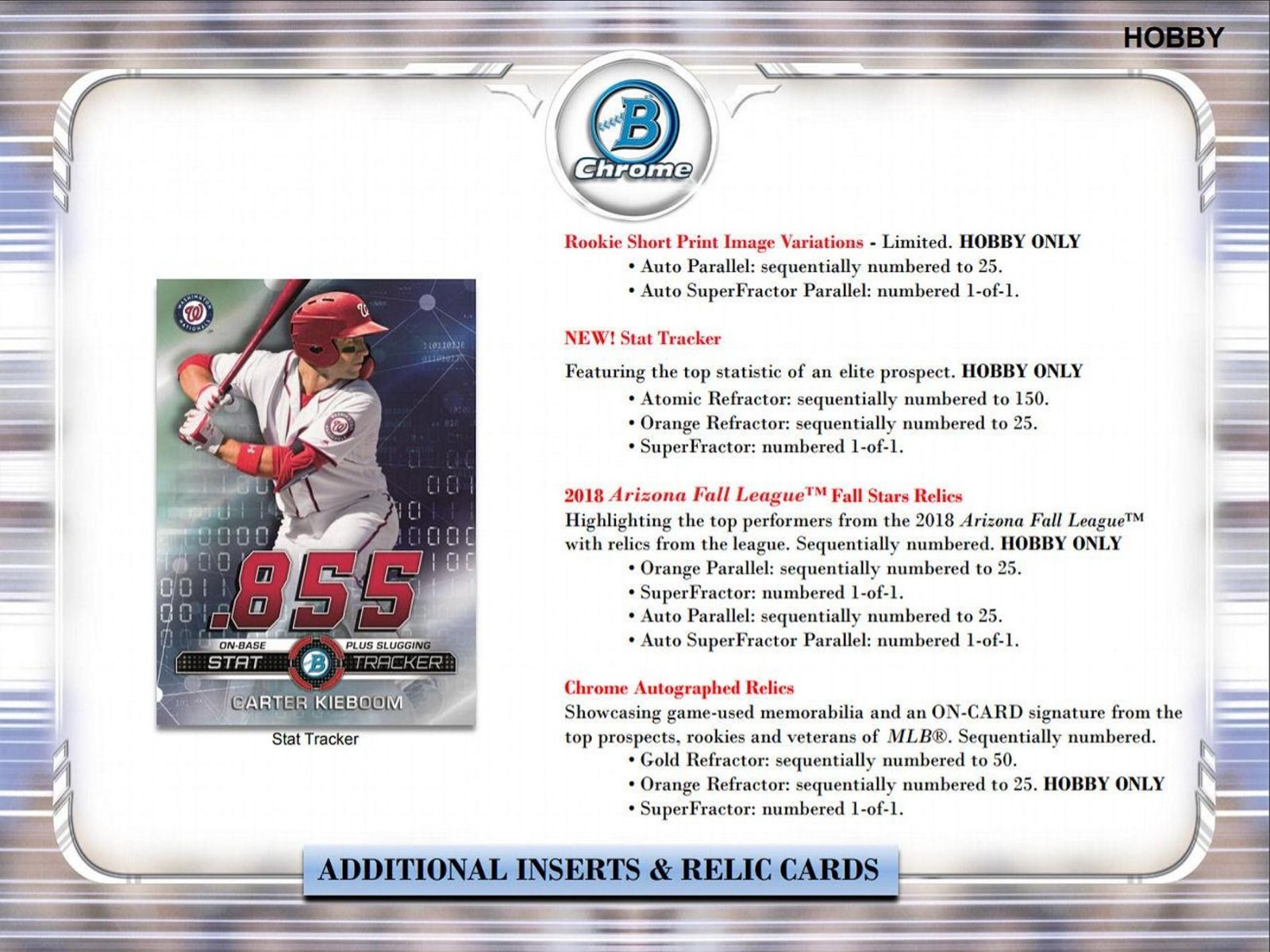 2018 Arizona Fall League Fall Stars Relics:Â Highlighting the top performers from the 2018 Arizona Fall League with relics from the league. Sequentially numbered. HOBBY ONLY