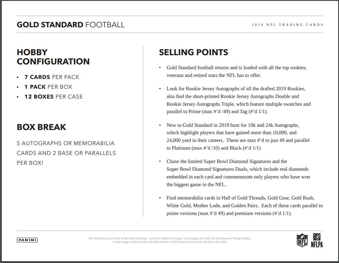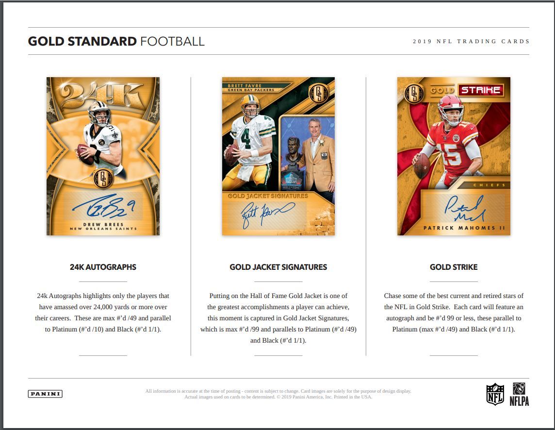 Chase some of the best current and retired stars of the NFL in Gold Strike. Each card will feature an autograph and be #’d 99 or less, these parallel to Platinum (max #’d /49) and Black (#’d 1/1).