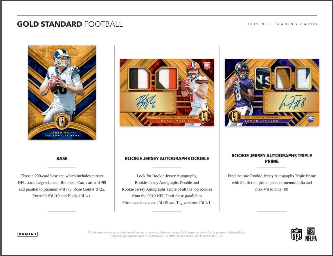 Chase a 200-card base set, which includes current NFL stars, Legends, and Rookies. Cards are #’d /99 and parallel to platinum #’d /75, Rose Gold #’d /25, Emerald #’d /10 and Black #’d 1/1.