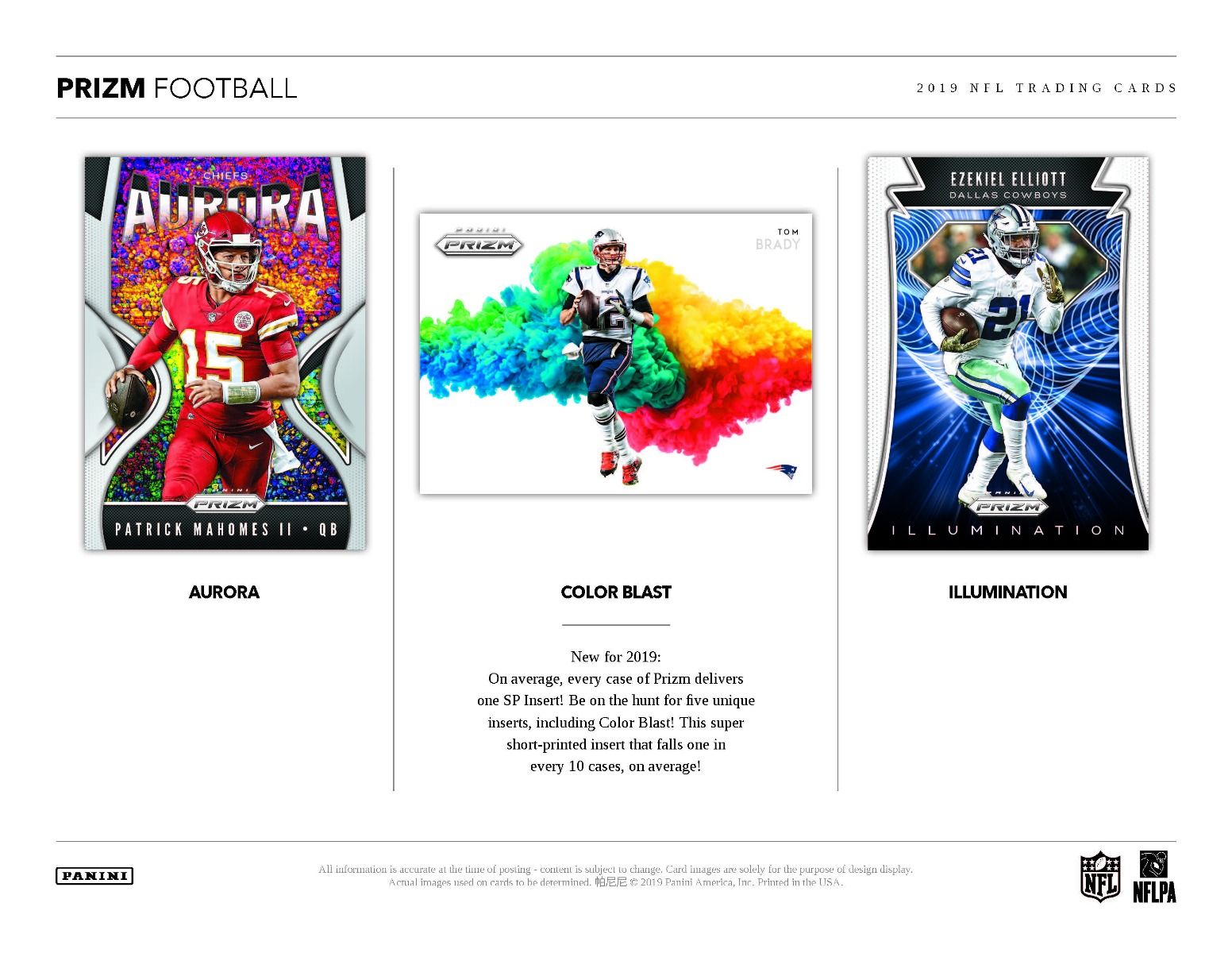 - New for 2019: On average, every case of Prizm delivers one SP Insert! Be on the hunt for five unique inserts, including Color Blast!