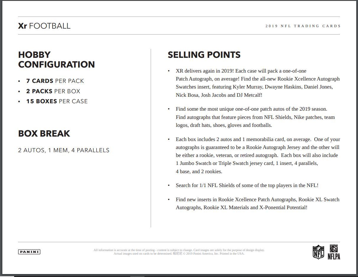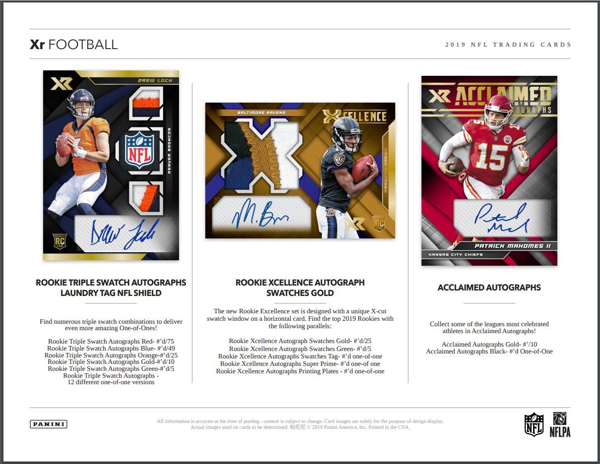 ROOKIE XCELLENCE AUTOGRAPH SWATCHES: The new Rookie Excellence set is designed with a unique X-cut swatch window on a horizontal card. Find the top 2019 Rookies with the following parallels: