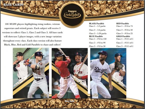 BASE CARDS: 100 MLB players highlighting rising rookies, veteran superstars and retired greats. Each subject will receive 3 versions to collect: Class 1, Class 2 and Class 3. All base cards will showcase 2 player images, with a new image variation throughout every class. Each class version will also feature Black, Blue, Red and Gold Parallels to chase and collect!