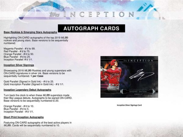 Inception Silver Signings: Showcasing 2018 MLB Rookies and young superstars with ON-CARD signatures in silver ink. Base versions to be sequentially numbered. 1 per Case