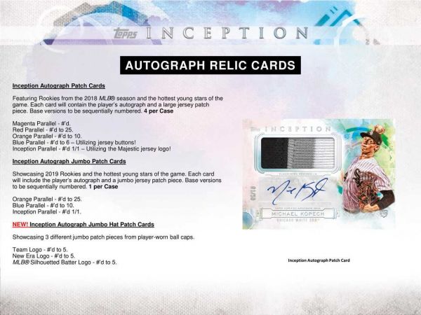 Inception Autograph Patch Cards: Featuring Rookies from the 2018 MLB season and the hottest young stars of the game. Each card will contain the player’s autograph and a large jersey patch piece.Â