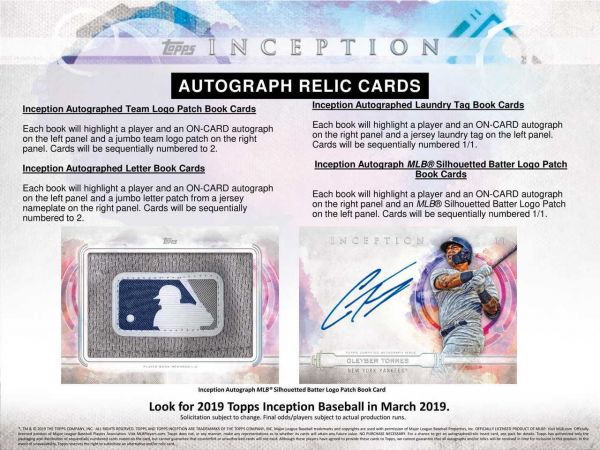 Inception Autograph Jumbo Patch Cards: Showcasing 2019 Rookies and the hottest young stars of the game. Each card will include the player’s autograph and a jumbo jersey patch piece.Â